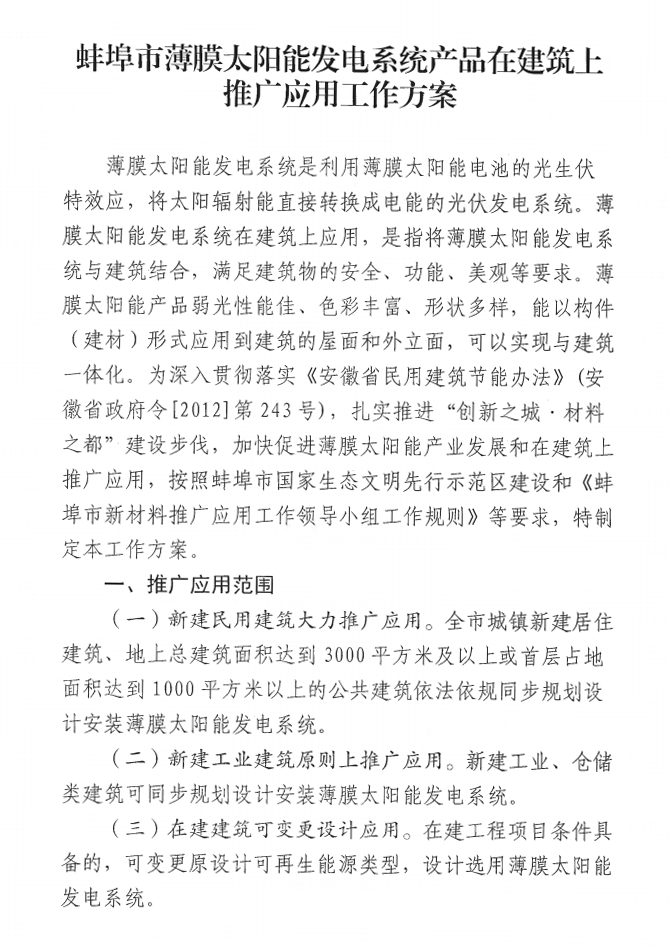 【国际能源网 讯】10月29日,安徽省蚌埠市住房城乡建设局(市行政执法局)发布《蚌埠市薄膜太阳能发电系统产品在建筑上推广应用工作方案》(以下简称《方案》),同时废止《铜铟镓硒薄膜太阳能发电系统产品在蚌埠市区建设工程推广应用方案》(建政秘[2019]127号)、《关于加强薄膜太阳能发电系统产品在保障性住房上推广应用的通知》、《关于薄膜太阳能发电系统产品在市区商品住宅工程试点应用的通知》。