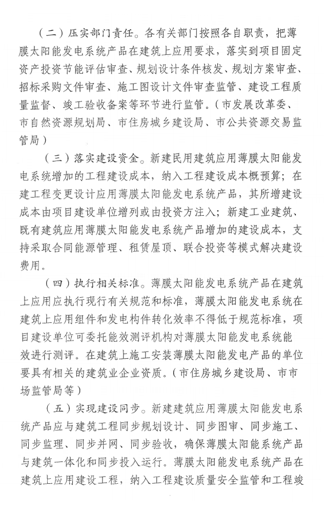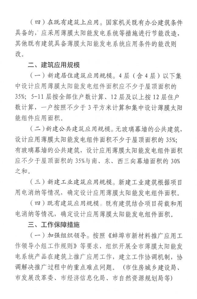 (一)新建民用建筑大力推广应用。全市城镇新建居住建筑、地上总建筑面积达到3000平方米及以上或首层占地面积达到1000平方米以上的公共建筑依法依规同步规划设计安装薄膜太阳能发电系统。